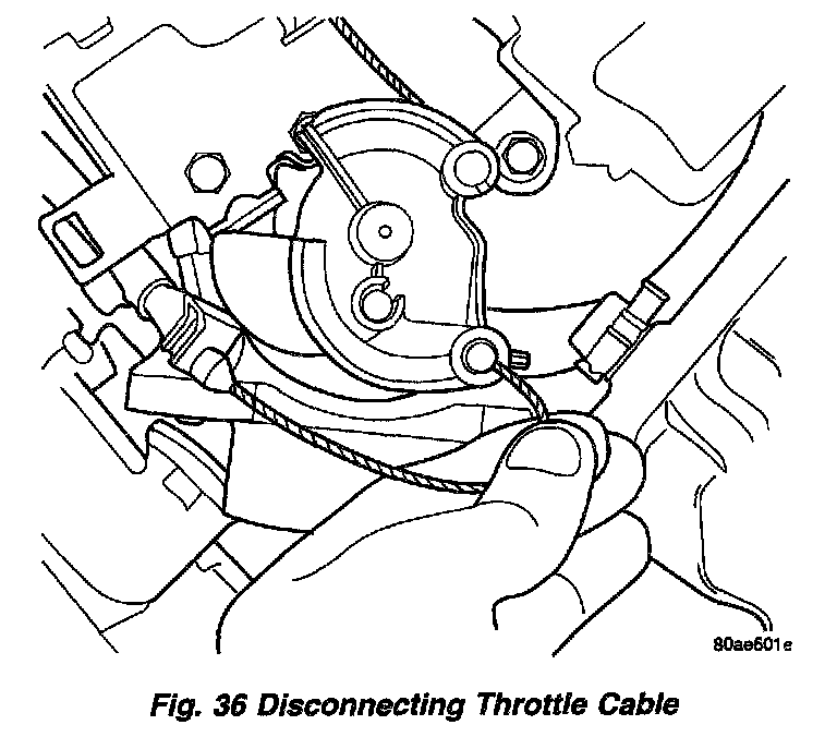2. Working from the engine compartment, remove throttle cable from throttle body cam (Fig. 35) and (Fig. 36).