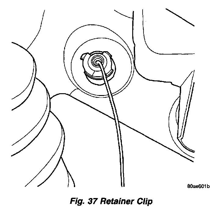 6. From inside the vehicle, hold up pedal and feed throttle cable core wire through hole in upper end of the pedal shaft. Install cable retainer (Fig. 37).