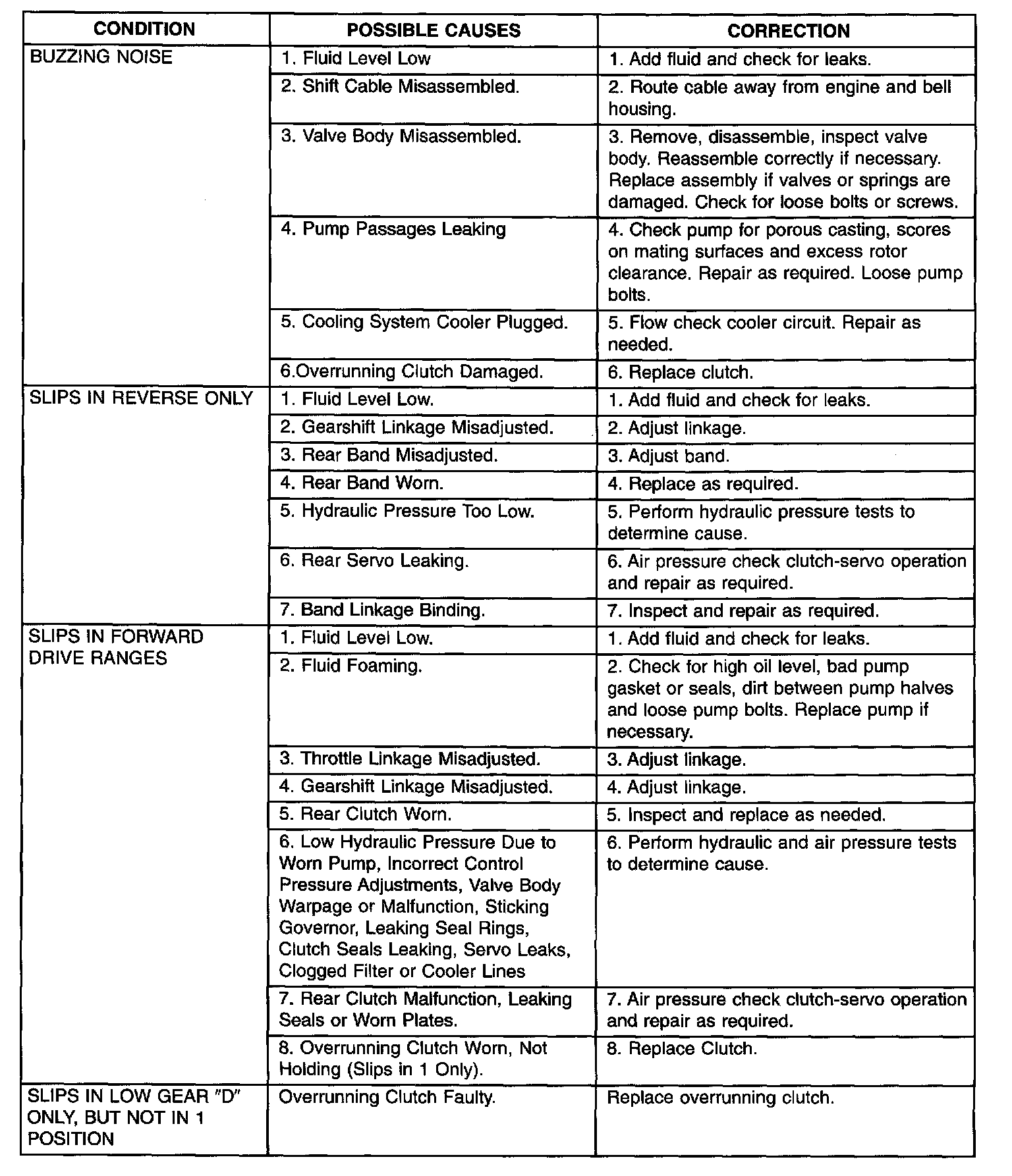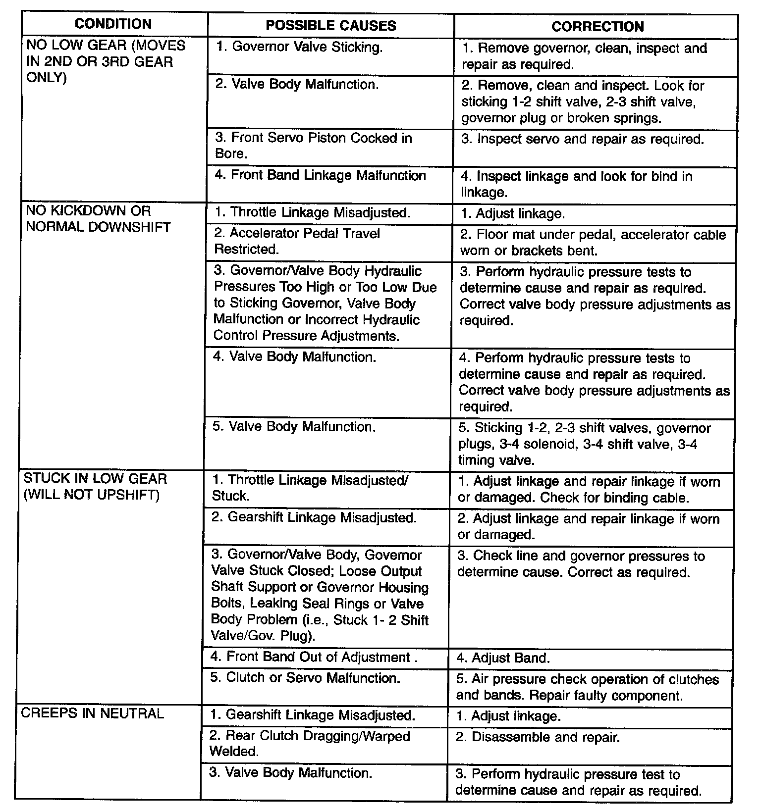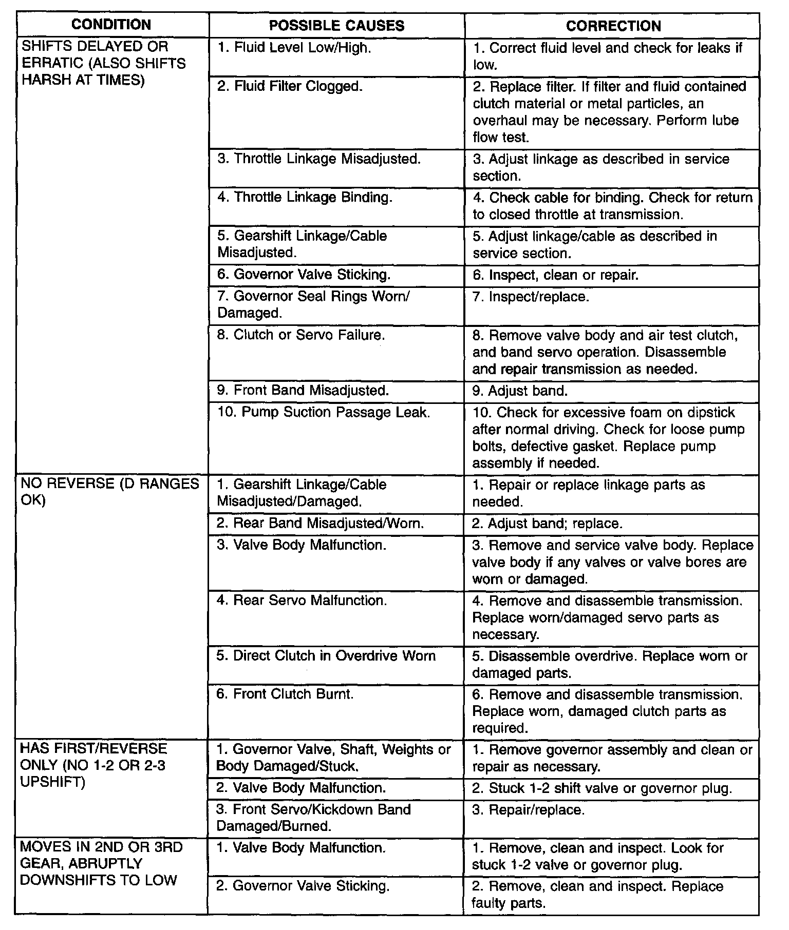 After verifying or adjusting these variables, road test the vehicle to determine if the problem has been corrected or that further diagnosis is necessary. If the problem still exists, refer to the following diagnosis charts to aid in determining the source or cause of failure.