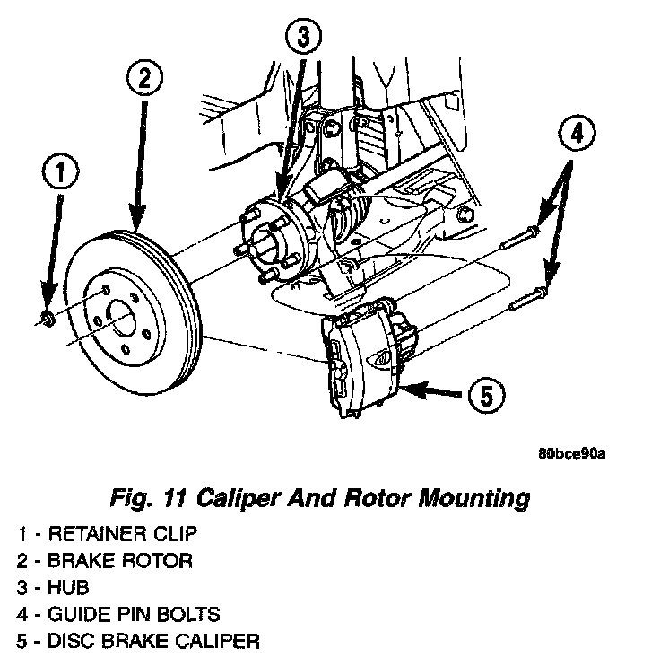 5. Remove the disc brake caliper from the steering knuckle. The caliper is removed by first tipping either the top (right side caliper) or bottom (left side caliper) of the caliper away from the brake rotor, then pulling the caliper off the opposite end's caliper slide abutment (on the knuckle) and brake rotor.