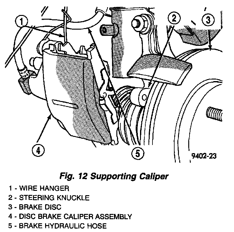 6. Support the caliper using a wire or cord to prevent the weight of caliper from damaging the brake hose. Do not let the caliper hang by the brake hose.