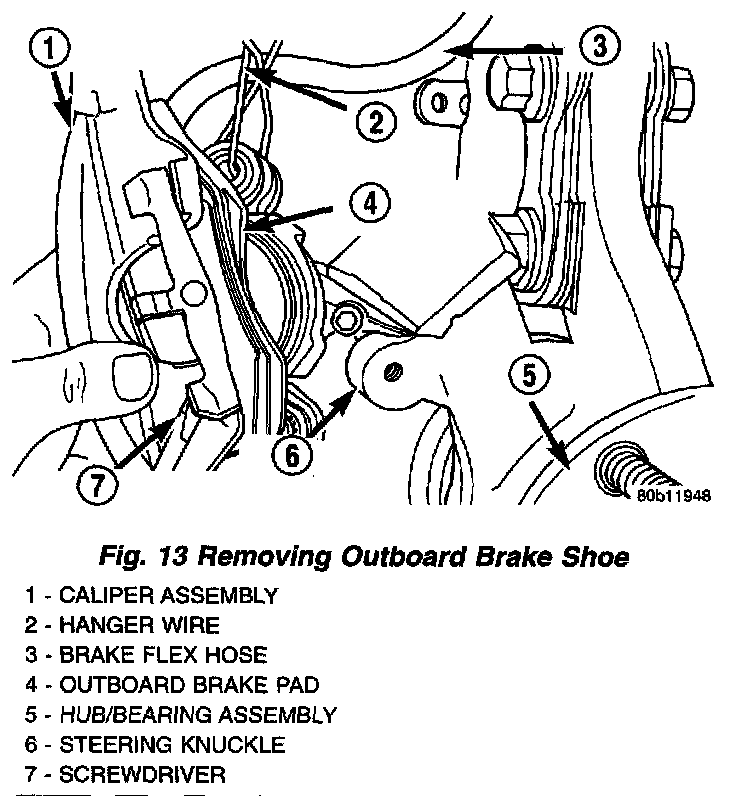 7. Remove the outboard brake shoe from the caliper by prying the shoe retaining clip over the raised area on the caliper. Slide the brake shoe down and off of the caliper.
