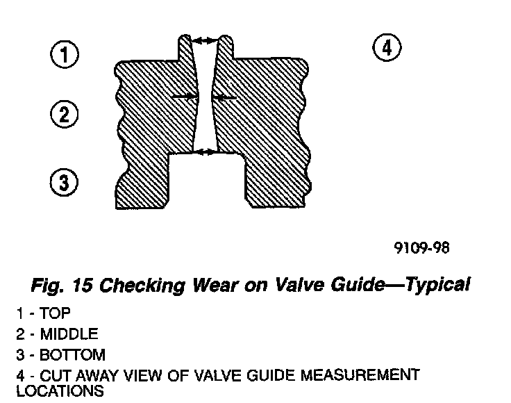 4. Using a small hole gauge and a micrometer, measure valve guides in 3 places top, middle and bottom (Fig. 15). Replace guides if they are not within specification.