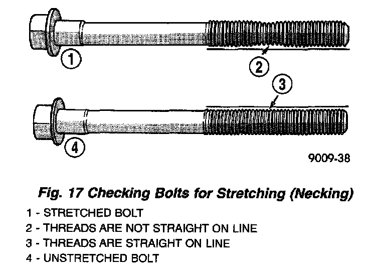 NOTE: The cylinder head bolts should be examined BEFORE reuse. If the threads are necked down, the bolt(s) should be replaced (Fig. 17).