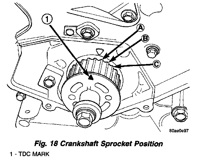 4. Position crankshaft sprocket to TDC, then rotate crankshaft until mark is three teeth before TDC (Fig. 18). This will ensure that no piston-to-valve contact occurs upon installation of cylinder head in the event of camshaft rotation.