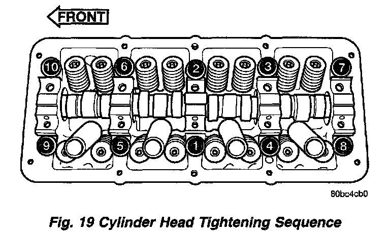 7. Tighten the cylinder head bolts in the sequence shown in (Fig. 19). Using the 4 step torque method, tighten according to the following values: