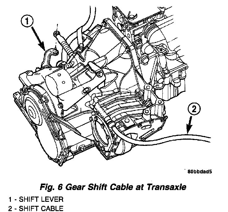 7. Disconnect shifter cable from shift lever and remove from bracket (Fig. 6). Secure cable out of the way.