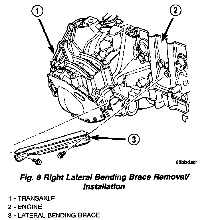 12. Remove the right engine-to-transaxle lateral bending brace (Fig. 8).