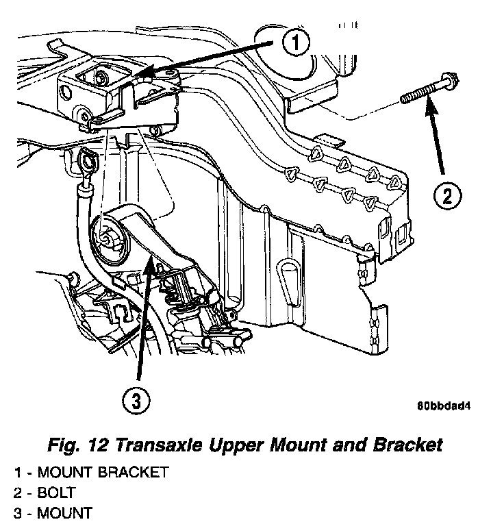 20. Remove transaxle upper mount thru-bolt. Gain access to this bolt through the driver's side wheel house (Fig. 12).