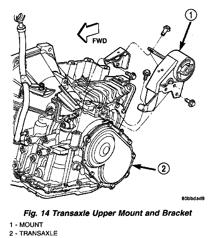 25. If installing a new or replacement transaxle, remove the upper mount and bracket as shown in (Fig. 14), and transfer to the replacement unit and torque all bolts to 68 Nm (50 ft. lbs.) torque.