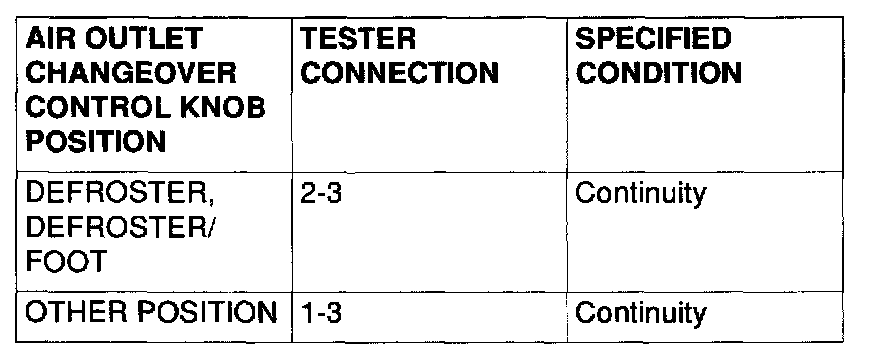 WHEN THE AIR OUTLET CHANGEOVER CONTROL KNOB IS MOVED TO DEFROSTER OR DEFROSTER/FOOT POSITION, THE A/C OR THE INSIDE/OUTSIDE AIR CHANGEOVER DAMPER MOTOR DOES NOT OPERATE.DIAGNOSIS