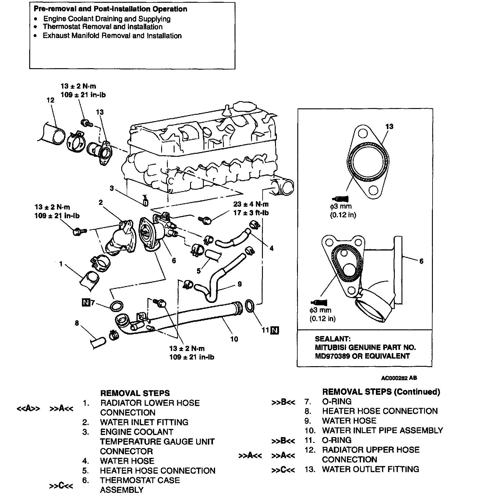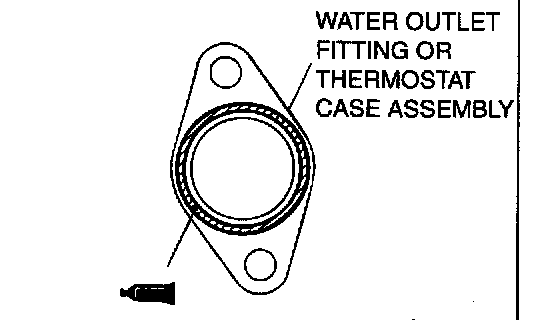 Apply a continuous bead of MITSUBISHI GENUINE Sealant Part number MD970389 or equivalent to the thermostat housing mating surface