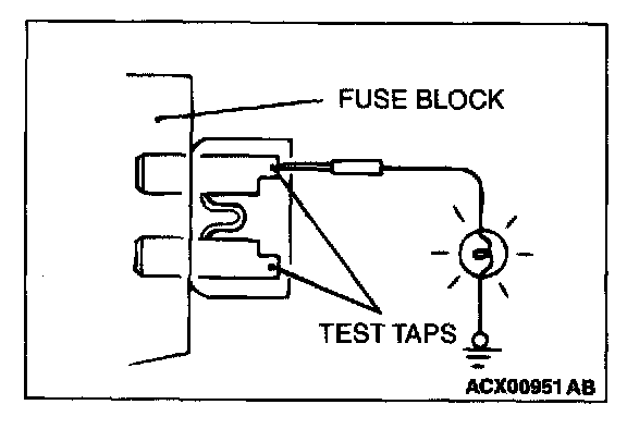 A blade type fuse has test taps provided to allow checking of the fuse itself without removing it from the fuse block. The fuse is okay if the test light comes on when its one lead is connected to the test taps (one at a time) and the other lead is grounded. Remember to turn the ignition switch to ON to ensure all circuits are live.