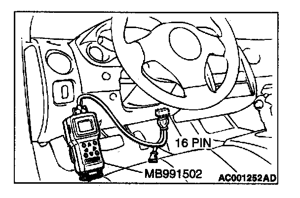 CAUTION: To prevent damage to scan tool MB991502, always turn the ignition switch to the "LOCK" (OFF) position before connecting or disconnecting scan tool MB991502.