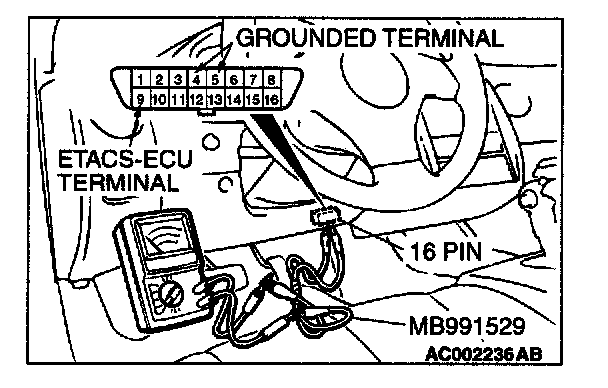 1. Use special tool MB991529 to connect a voltmeter between ground terminal 4 or 5 and ETACS-ECU terminal 9 of the data link connector.