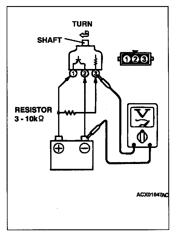 2. Turn the shaft of the vehicle speed sensor and check that there is voltage between terminals 2 - 3. (1 turn = 4 pulses)