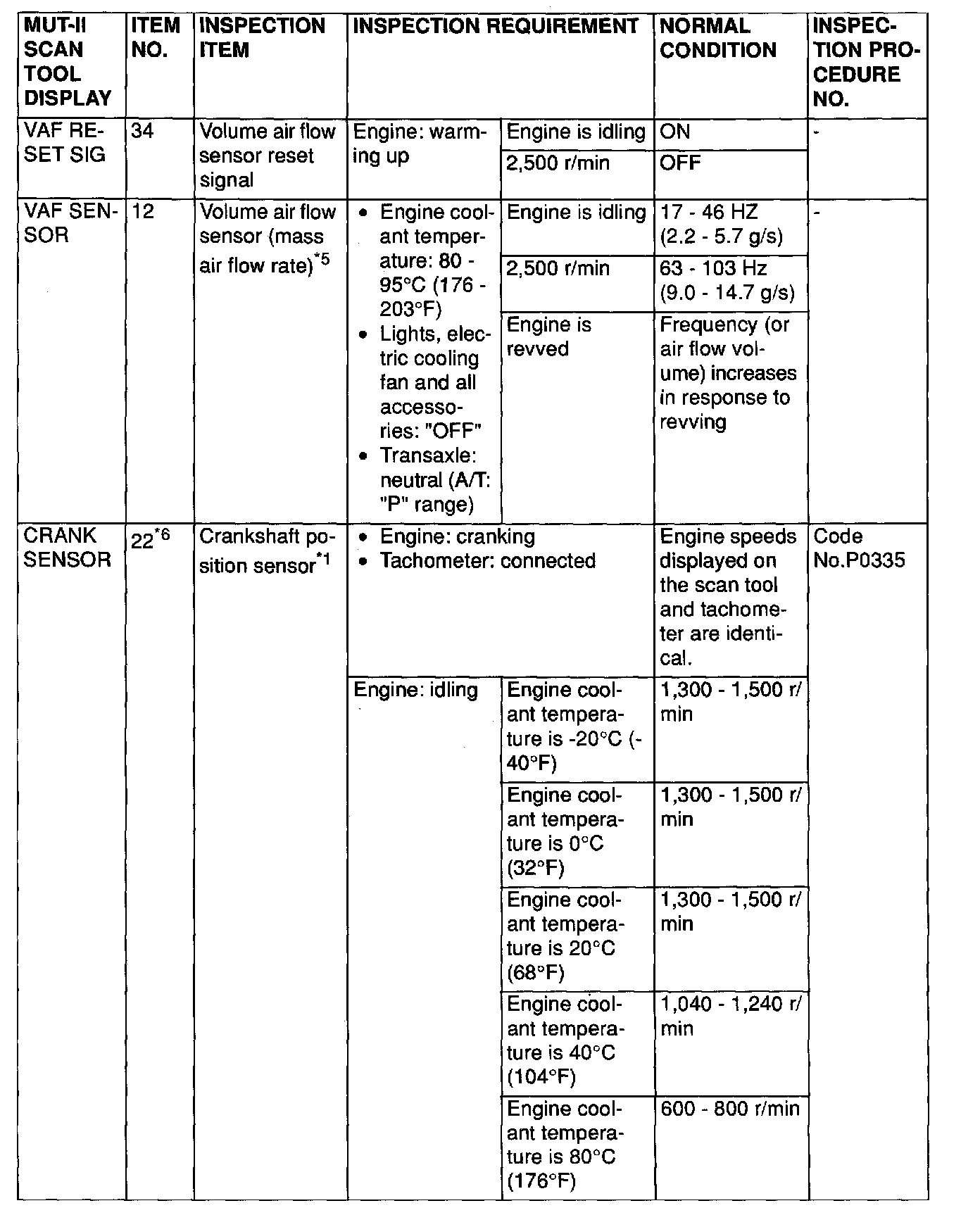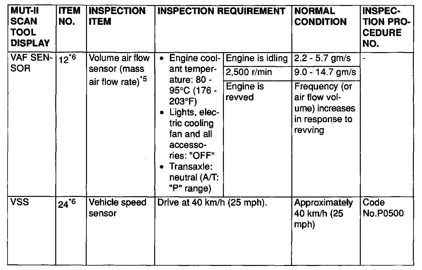 NOTE: *5: In a new vehicle [driven approximately 500 km (311 mile) or less], the volume air flow sensor output frequency is sometimes 10% higher than the standard frequency