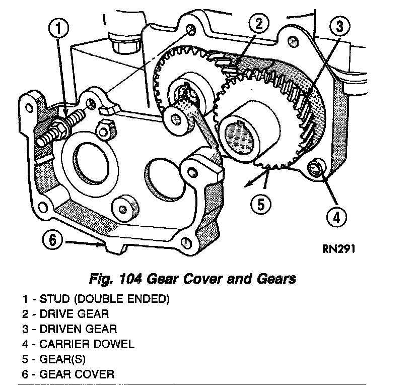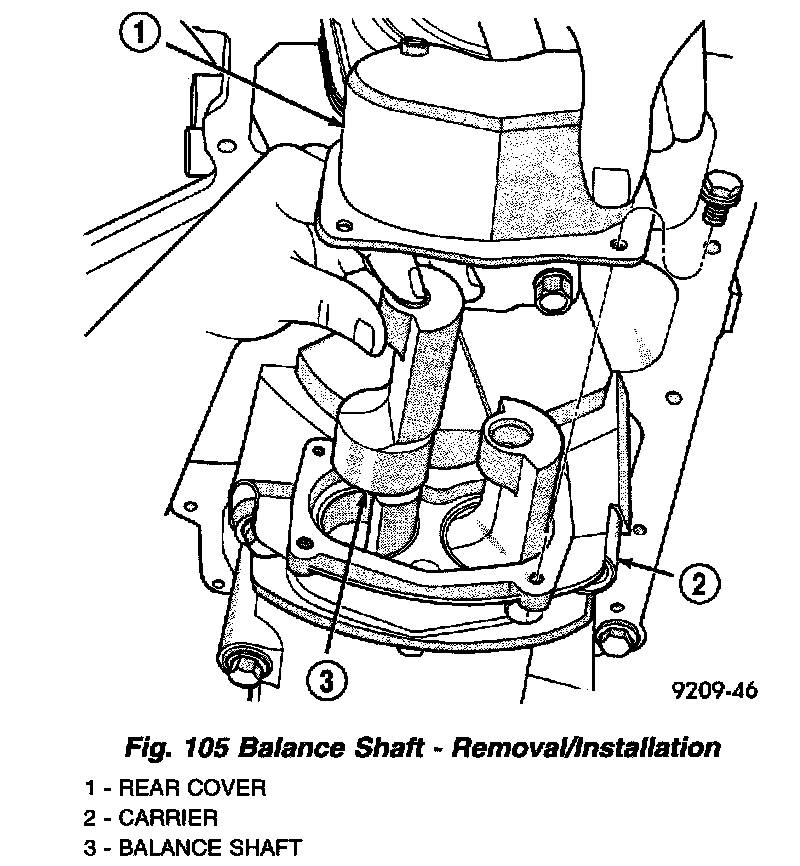 The following components will remain intact during carrier removal. Gear cover, gears, balance shafts and the rear cover (Fig. 105).
