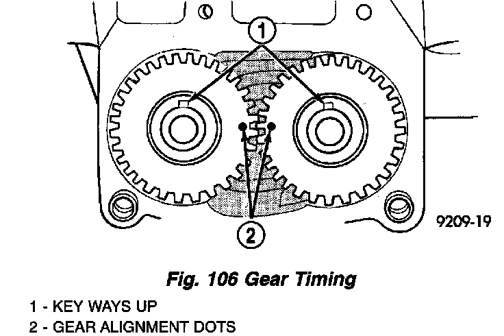 2. Turn balance shafts until both shaft key ways are up, parallel to vertical centerline of engine. Install short hub drive gear on sprocket driven shaft and long hub gear on gear driven shaft. After installation gear and balance shaft keyways must be up with gear timing marks meshed as shown in (Fig. 106).