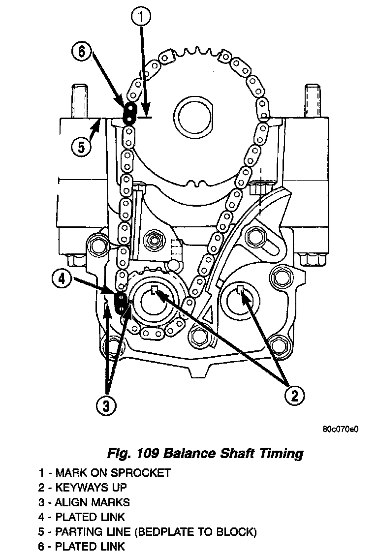 7. Place chain over crankshaft sprocket so that the plated link of the chain is over the number 1 cylinder timing mark on the balance shaft crankshaft sprocket (Fig. 109).