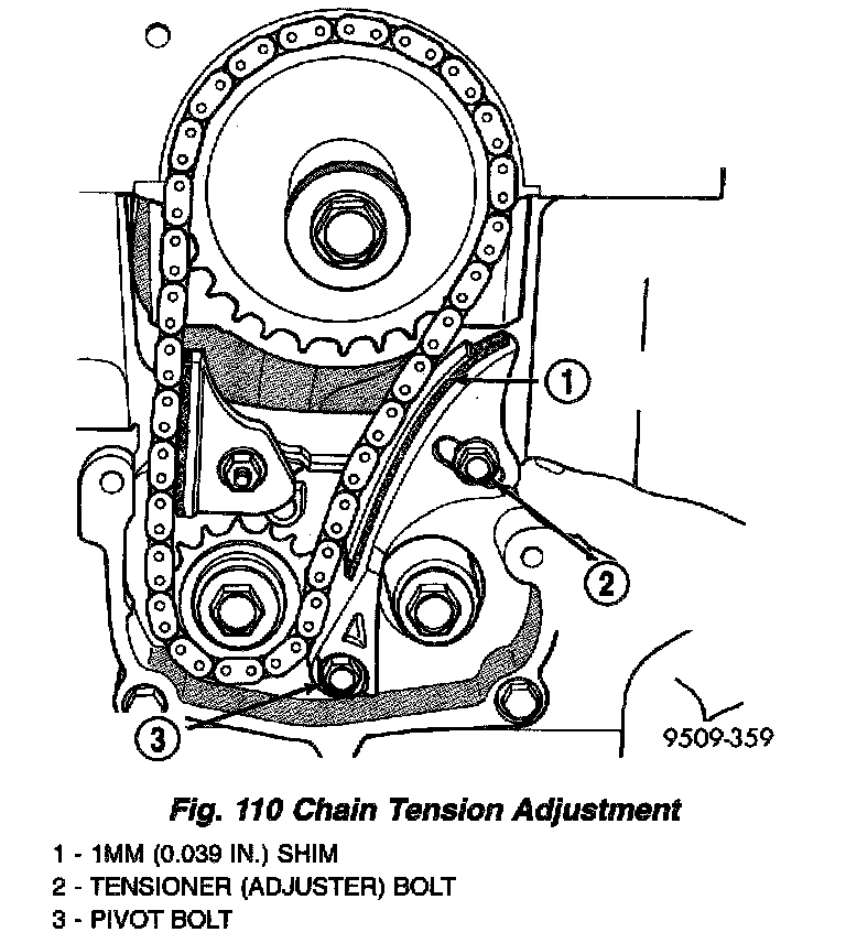 c. Place a shim 1 mm (0.039 inch) thick x 70 mm (2.75 inch) long or between tensioner and chain. Push tensioner and shim up against the chain. Apply firm pressure 2.5 - 3 Kg (5.5 - 5.6 lbs.) directly behind the adjustment slot to take up all slack. Chain must have shoe radius contact as shown in (Fig. 110).
