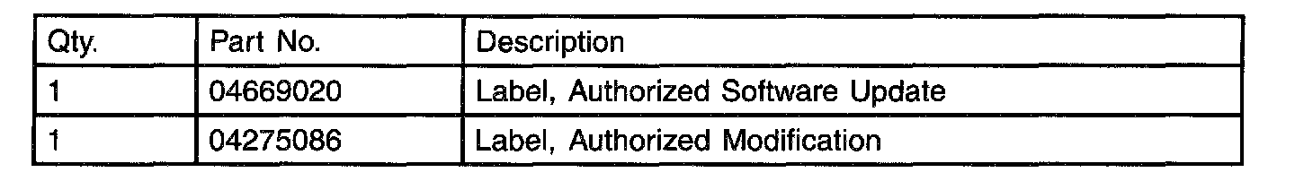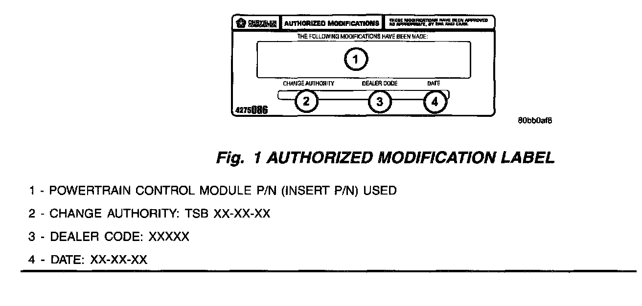 2. Type the necessary information on the "authorized Software Update Label" p/n 04669020 (Fig. 1). Attach the label to the PCM and cover the label with the clear plastic overlay. Type the necessary information on the "Authorized Modification Label" p/n 04275086 (Fig. 2) and attach the label near the VECI label.