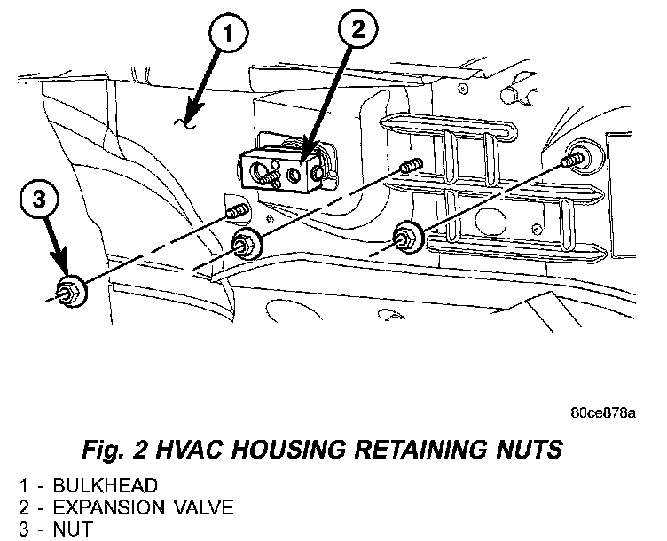 4. Remove the two top HVAC housing retaining nuts in engine compartment (Fig. 2).
