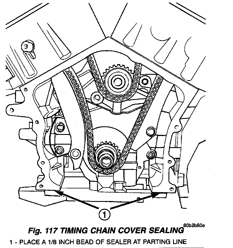 2. Before installing timing cover gasket apply a 1/8 inch bead of Mopar Engine RTV GEN II to the parting lines between the oil pan and cylinder block (Fig. 117).