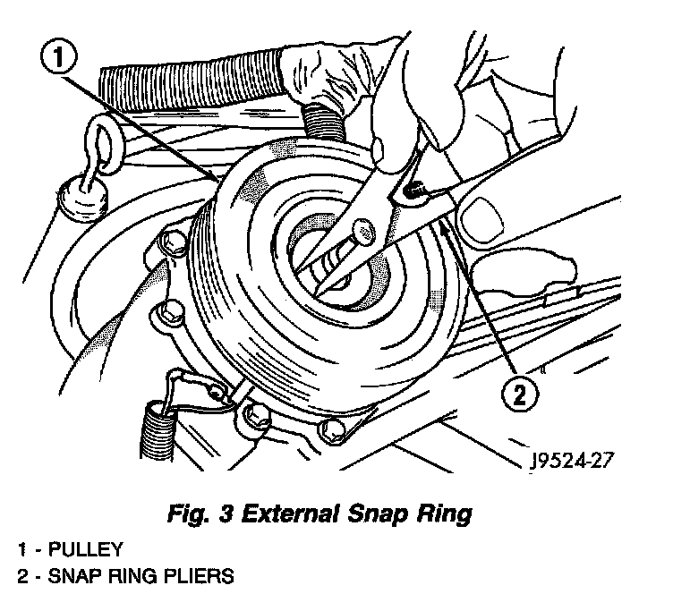 CAUTION: If snap ring is not seated in the groove it will vibrate out and cause clutch failure and severe compressor damage will occur.