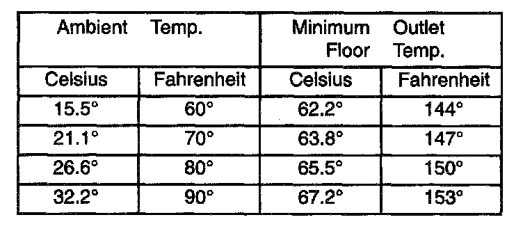 Engine coolant is provided to the heater system by two 16 mm (5/8 inch inside diameter) heater hoses. With engine idling at normal running temperature, set the control to maximum heat, floor, and high blower setting. Using a test thermometer, check the air temperature coming from the floor outlets, refer to Temperature Reference chart.