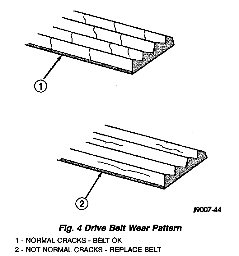 Poly-V Belt system may develop minor cracks across the ribbed side (due to reverse bending). These minor cracks are considered normal and acceptable. Parallel cracks are not (Fig. 4).