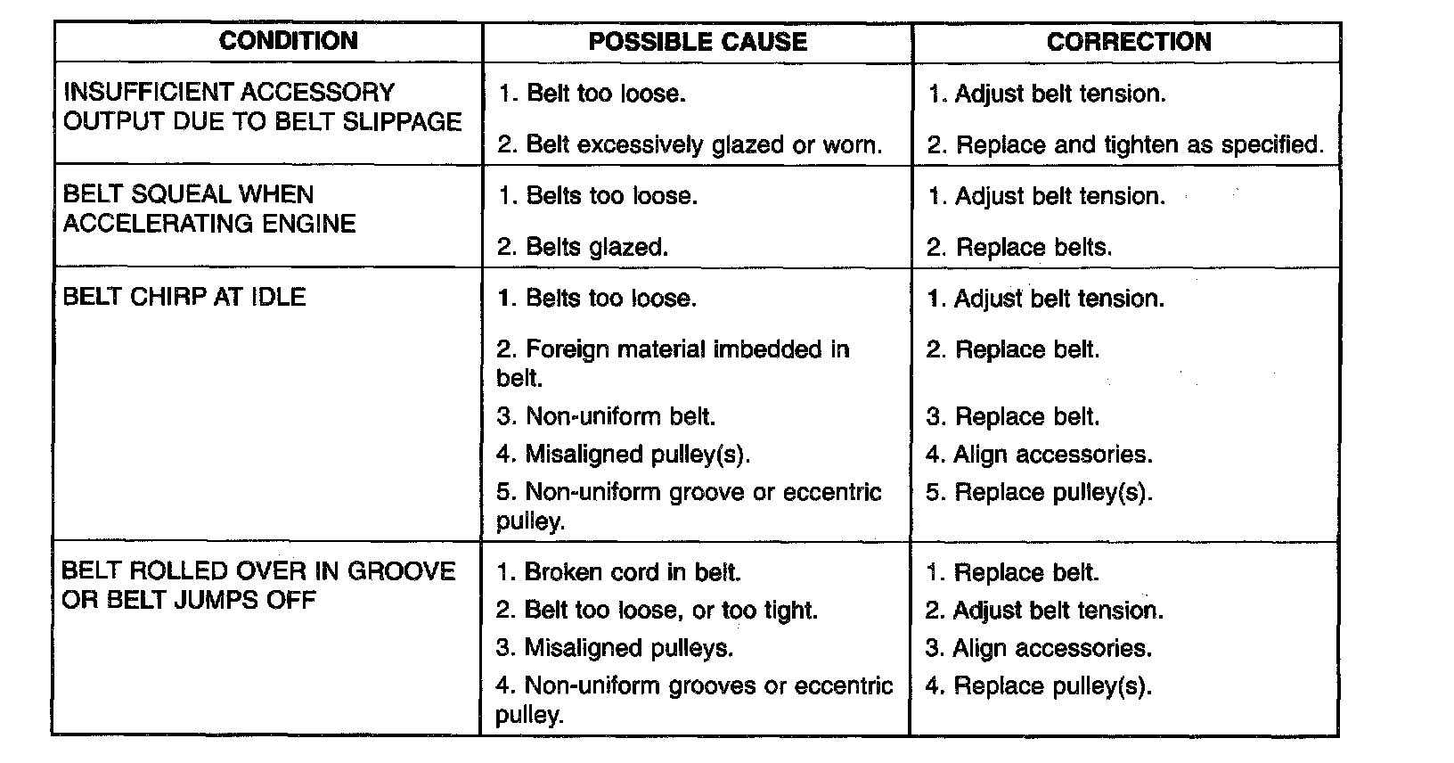 Satisfactory performance of the belt driven accessories depends on belt condition and proper belt tension.