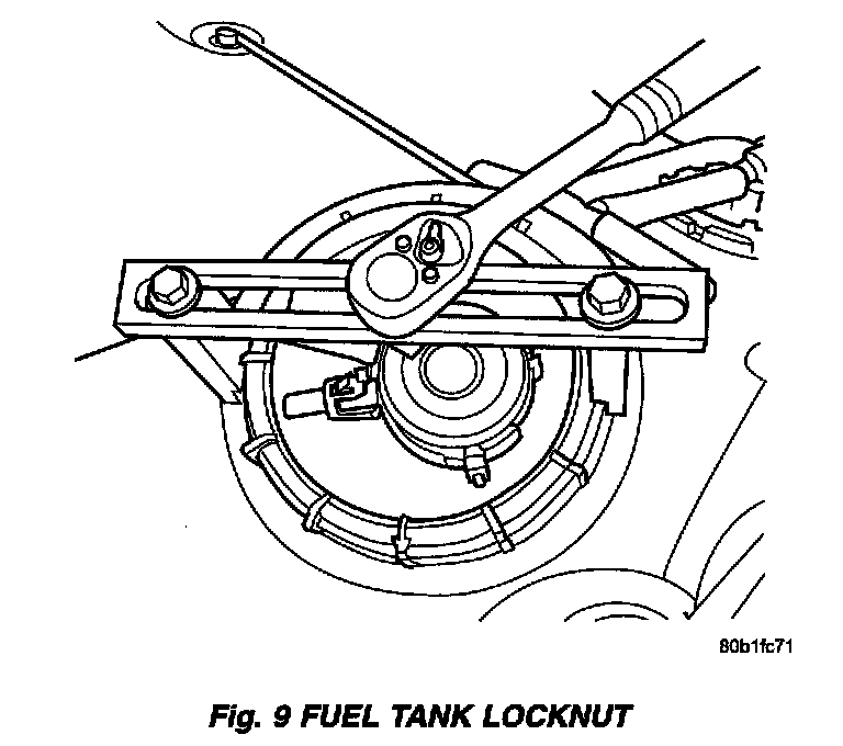 6. Use Special Tool # 6856 to remove fuel pump module locknut (Fig. 9).