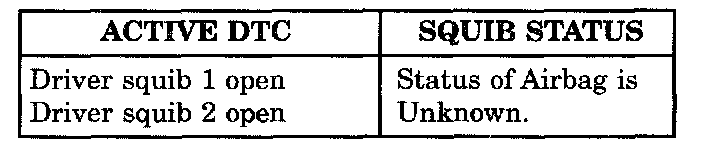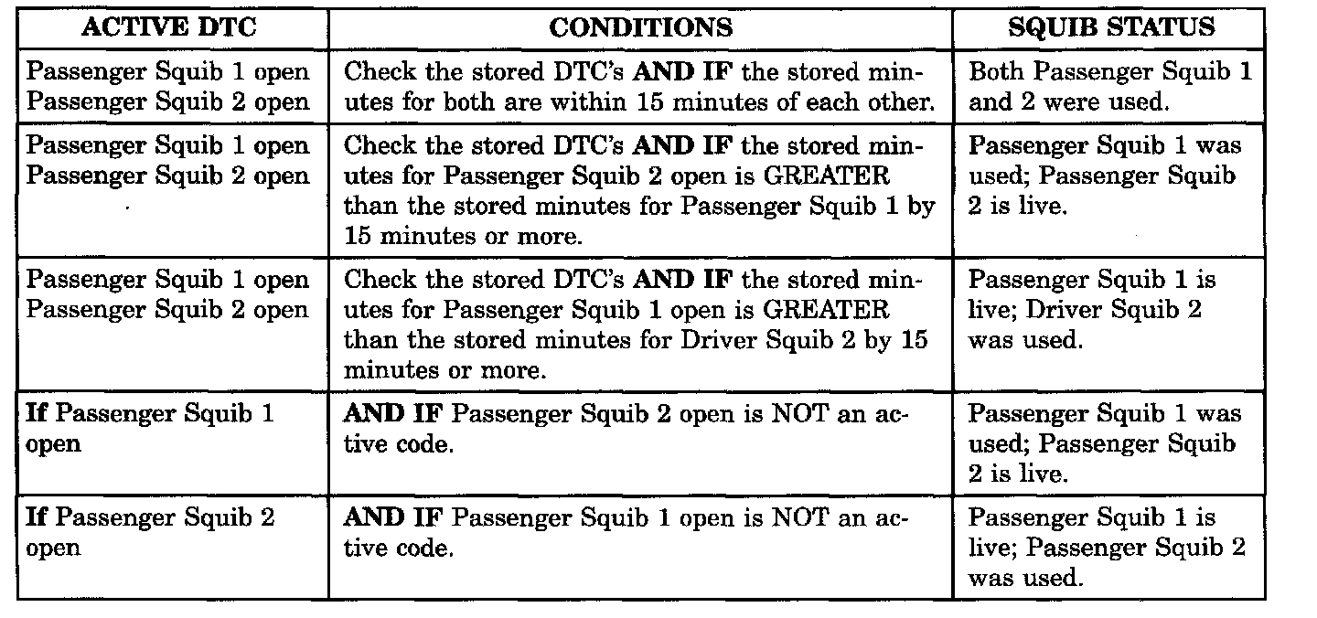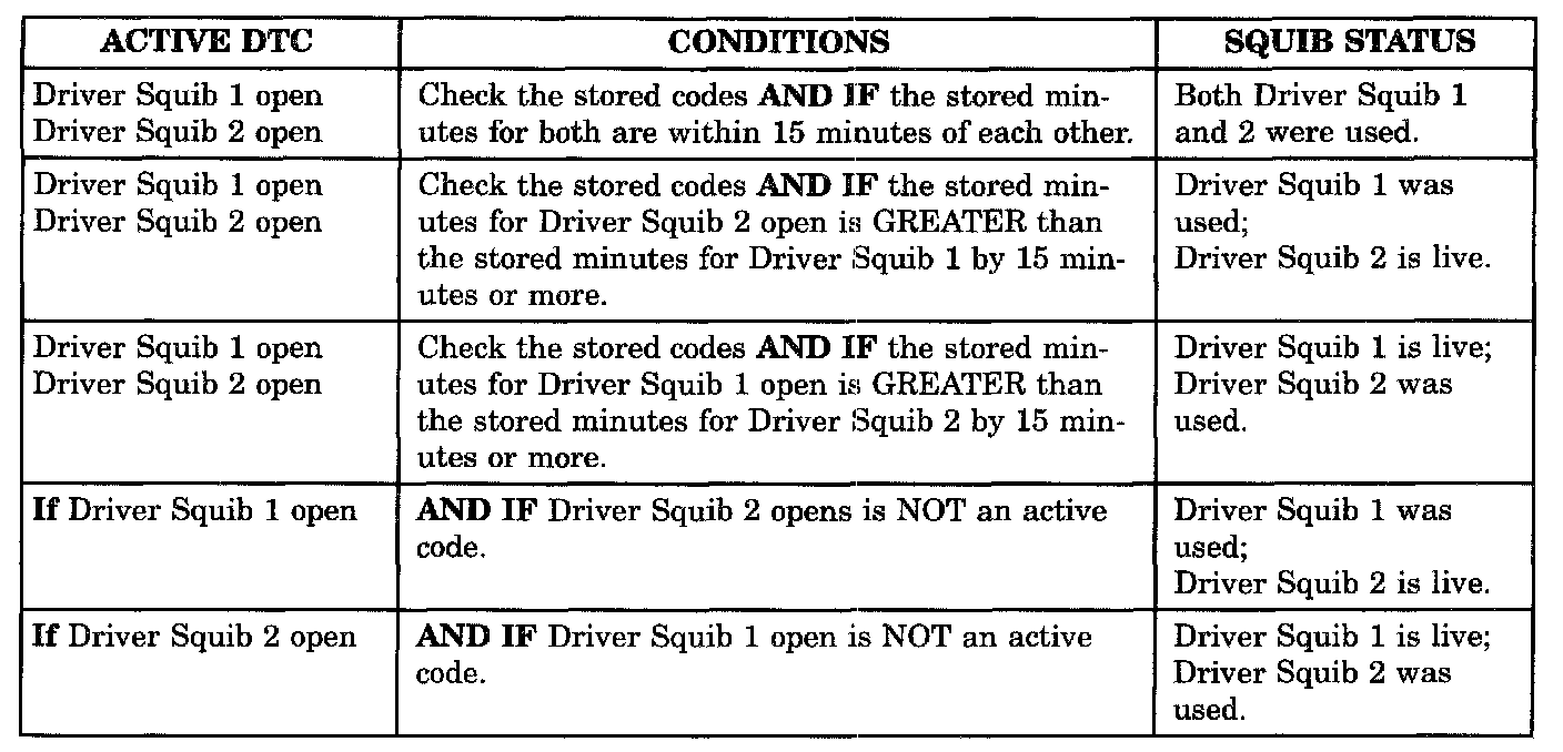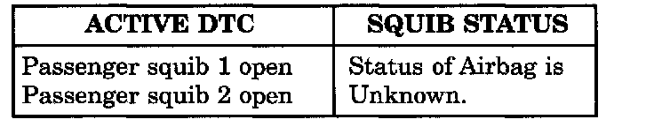CAUTION: DEPLOYED FRONT AIRBAGS MAY OR MAY NOT HAVE LIVE PYROTECHNIC MATERIAL WITHIN THE AIR BAG INFLATOR. DO NOT DISPOSE OF 2001 MODEL YEAR DRIVER AND PASSENGER AIRBAGS UNLESS YOU ARE SURE OF COMPLETE DEPLOYMENT. PLEASE REFER TO THE HAZARDOUS SUBSTANCE CONTROL SYSTEM FOR PROPER DISPOSAL. DISPOSE OF DEPLOYED AIRBAGS IN A MANNER CONSISTENT WITH STATE, PROVINCIAL, LOCAL, AND FEDERAL REGULATIONS. USE THE FOLLOWING TABLE TO IDENTIFY THE STATUS OF THE AIRBAG SQUIB.