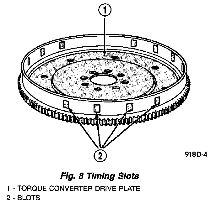 The crankshaft position sensor detects slots cut into the transmission driveplate extension. There are 3 sets of slots. Each set contains 4 slots, for a total of 12 slots. Basic timing is set by the position of the last slot in each group. Once the Powertrain Control Module (PCM) senses the last slot, it determines crankshaft position (which piston will next be at TDC) from the camshaft position sensor input. The 4 pulses generated by the crankshaft position sensor represent the 69°, 49°, 29 °, and 9° BTDC marks. It may take the PCM one engine revolution to determine crankshaft position.