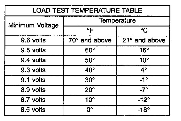 6. The voltage drop will vary with the battery temperature at the time of the load test. The battery temperature can be estimated by using the ambient temperature during the past several hours. If the battery has been charged, boosted, or loaded a few minutes prior to the test, the battery will be somewhat warmer. See the Load Test Temperature Table for the proper loaded voltage reading.