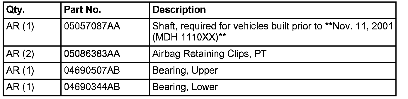 21. Install the original steering column shaft, except for vehicles built prior to Oct. 1, 2001 (MDH 1001Xx) install revised shaft p/n 04690852AA, revised wedge, p/n 04690570, and **revised spring, p/n 05057088AA.**