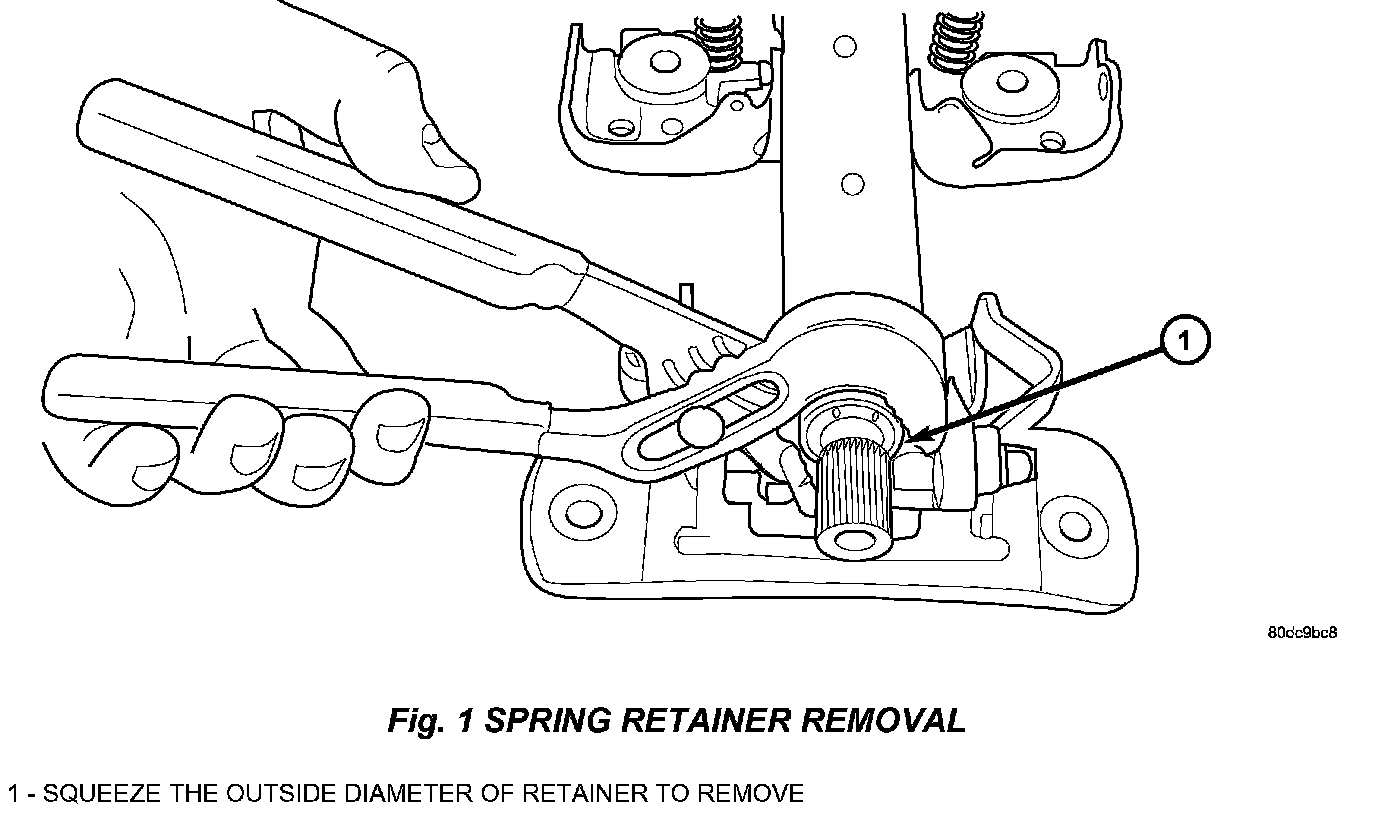17. Remove the spring retainer by squeezing the outside diameter with pliers and sliding it off the end of the steering column shaft.(Fig. 1).