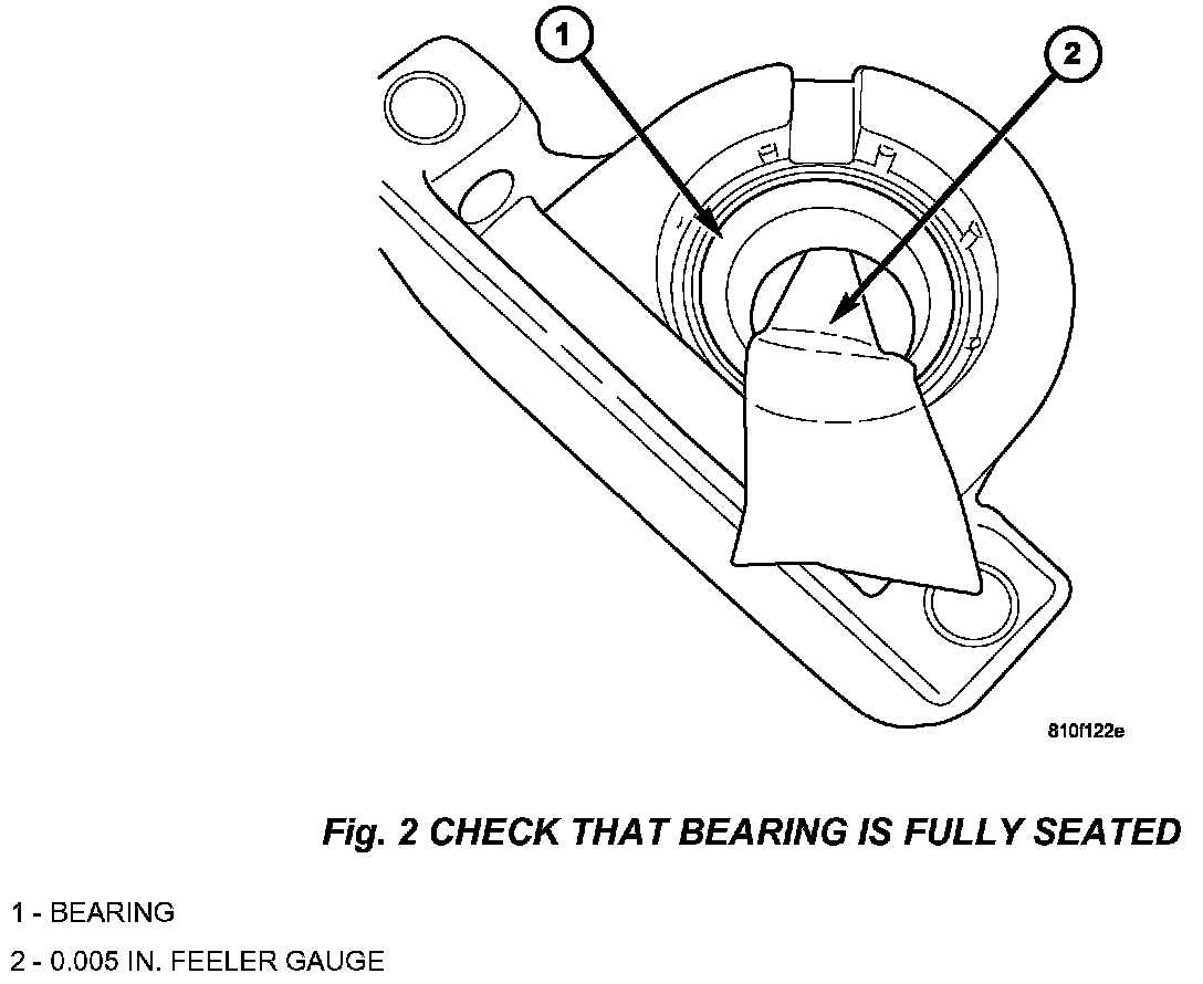 20. Stand the steering column on end so the outer race of the upper bearing is supported on a 1-1/16 in. socket. Using a 7/8" deep well socket or other suitable tool placed against the lower bearing outer race tap the bearing downward several times with a brass hammer until the bearing is fully seated. Use a 0.005" feeler gauge to make sure no clearance exists between the lower casting and the outer race of the lower bearing. (Fig. 2)
