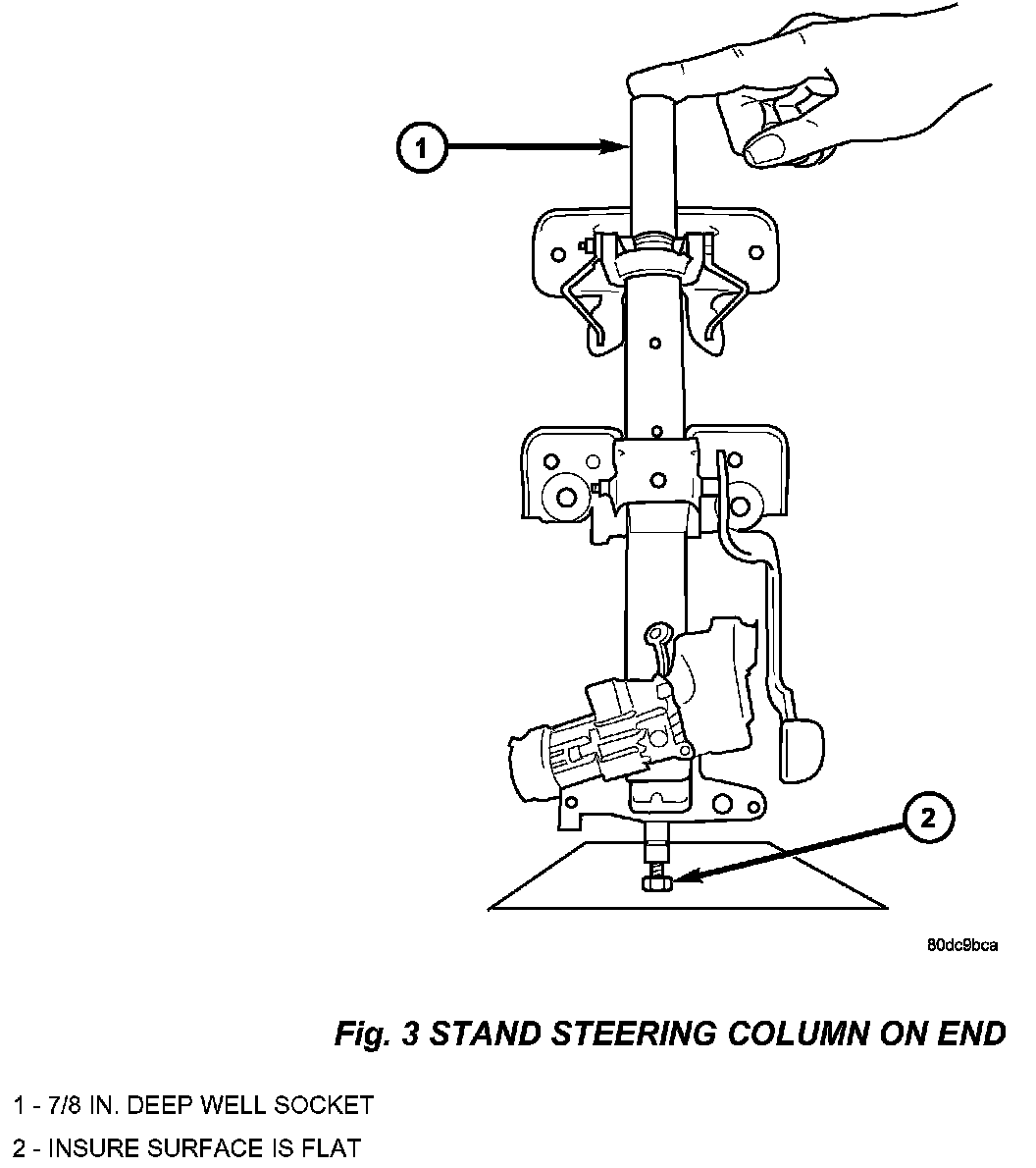 23. Stand the column assembly on the head of the steering wheel bolt, insure the surface is flat. Refer to (Fig. 3).
