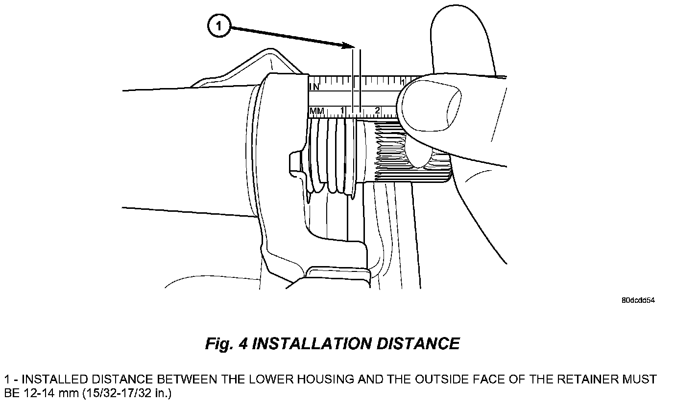 24. Install a new retainer, p/n 04664130, onto the steering column shaft by using a 7/8" deep well socket and small hammer to tap the retainer into place so the installed distance between the lower housing and the outside face of the retainer is 12-14 mm (15/32-17/32 in.). If the retainer is installed to a distance less than 12 mm (15/32 in.) remove the retainer and install a new retainer, repeat as necessary until the installed distance is 12-14 mm (15/32-17/32 in.). Refer to (Fig. 4).