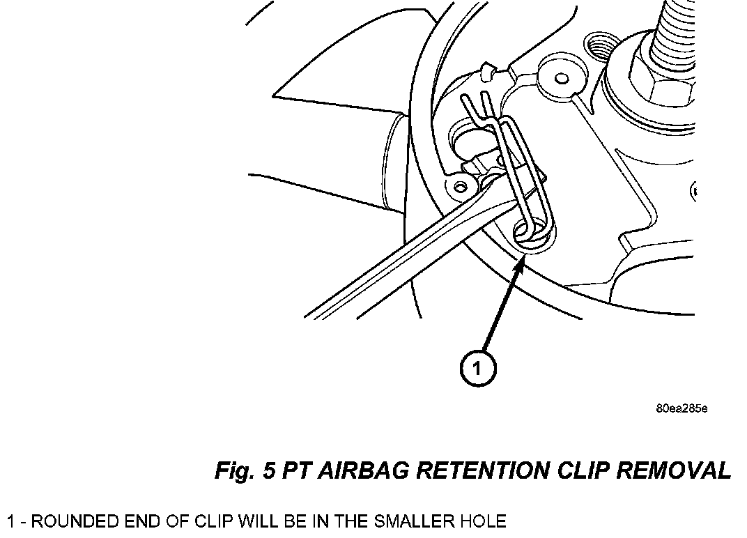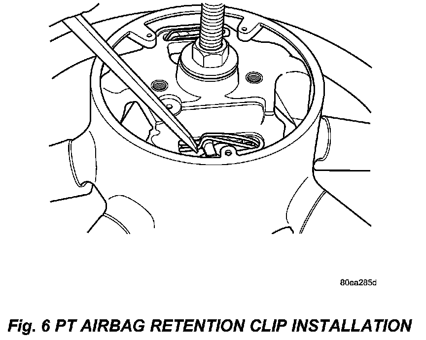 a. Use a large flat tipped screwdriver to pry up on the middle of the driver air bag retaining clip to remove it from the steering wheel armature holes. Refer to (Fig. 5)