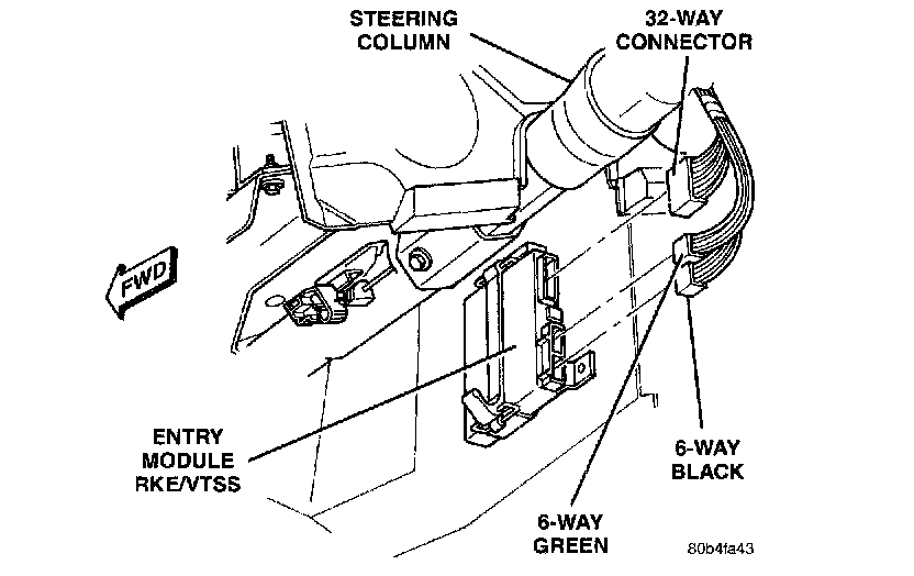 The entry module is located on the driver's side of the center floor tunnel underneath the instrument panel.