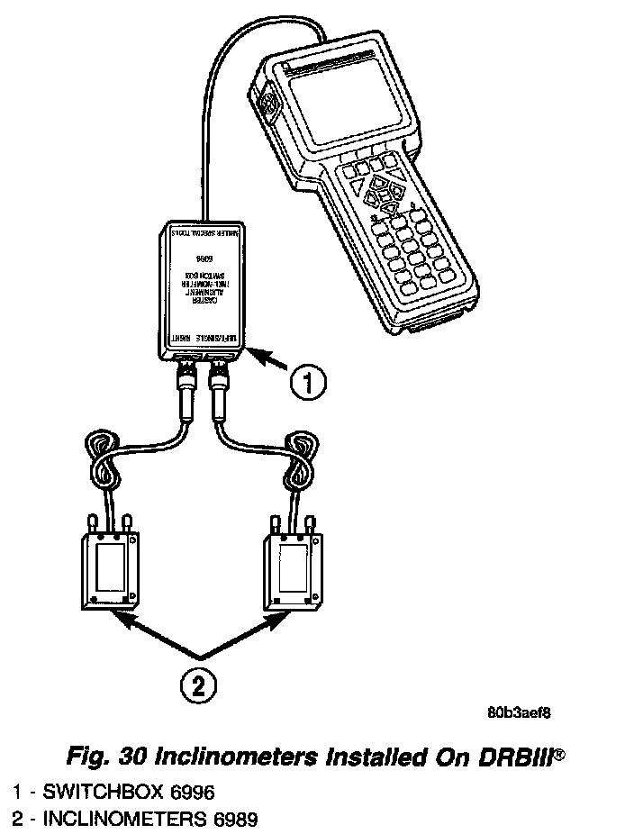 3. Attach the two inclinometers, Special Tool 6989, to the switch box. Only two inclinometers are supplied and should be used as a pair to measure either rear caster or front caster, one at a time.
