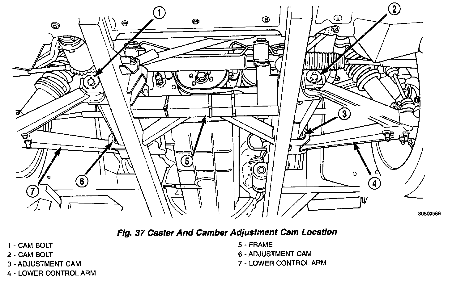 The camber and caster angles on this vehicle are adjustable using cams located on the lower control arm bushing pivot bolts. Correct camber and caster specifications are obtained by simultaneously rotating front and rear adjustment cams until lower control arm is correctly positioned.
