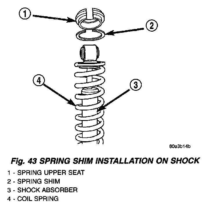 On vehicles with the standard suspension, spring shims or reduced height seats may be installed on the front or rear shock assemblies. Spring shim installation increases coil spring preload, thus raising the curb height of the vehicle. Reduced spring seat installation decreases coil spring preload, thus lowering the curb height of the vehicle.