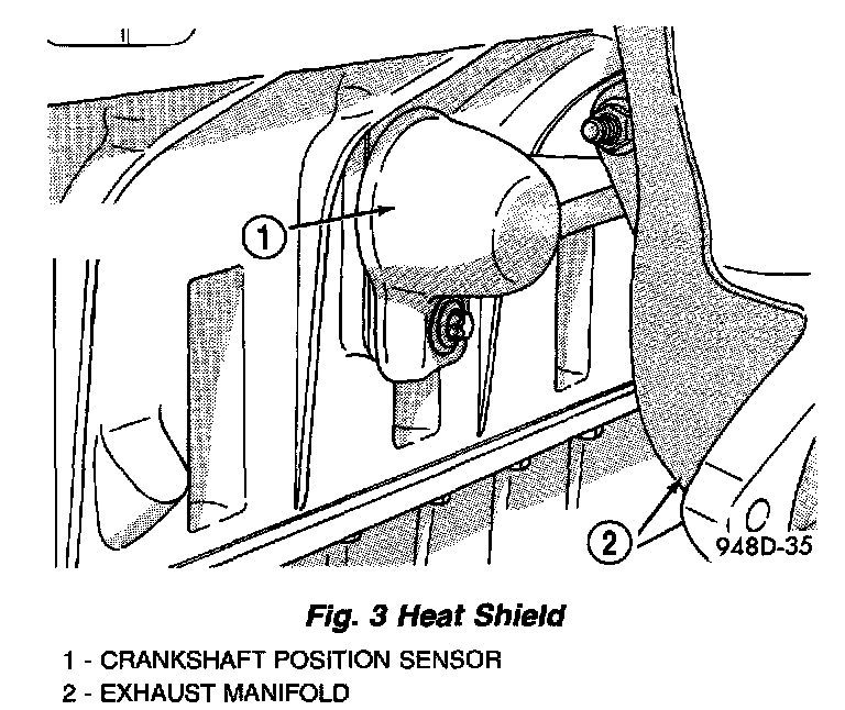 A heat shield covers the crankshaft position sensor. The sensor is located in the middle of the right side of the cylinder block, just above the oil pan.