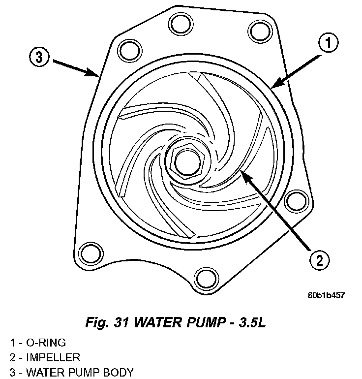 NOTE: It is normal for the water pump to weep a small amount of coolant from the weep hole (black stain on water pump body). Do not replace the water pump if this condition exists. Replace the water pump if a heavy deposit or a steady flow of engine coolant is evident on water pump body. This indicates a shaft seal failure and pump must be replaced. Be sure to perform a thorough analysis before replacing water pump.