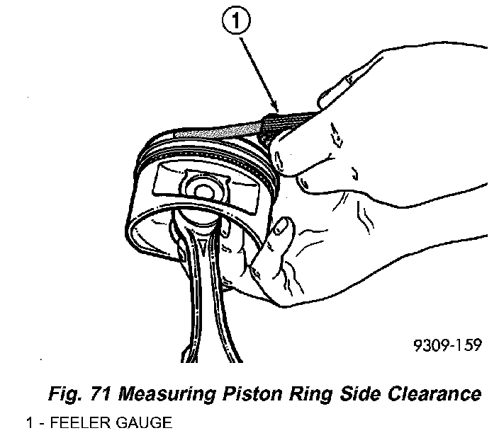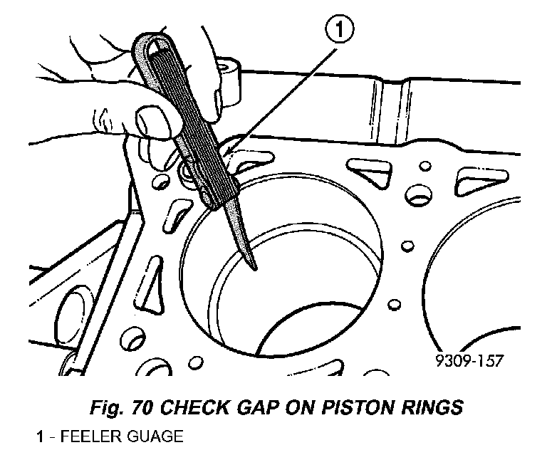 STANDARD PROCEDURE - PISTON RING FITTING1. Wipe cylinder bore clean. Insert ring and push down with piston to ensure it is square in bore. The ring gap measurement must be made with the ring positioning at least 12 mm (0.50 inch.) from bottom of cylinder bore. Check gap with feeler gauge (Fig. 70).