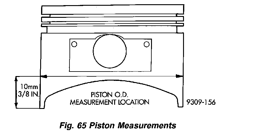 Piston and cylinder wall must be clean and dry. Piston diameter should be measured 90 degrees to piston pin at size location shown in (Fig. 65). Cylinder bores should be measured halfway down the cylinder bore and transverse to the engine crankshaft center line. Pistons and cylinder bores should be measured at normal room temperature, 70 °F (21 °C).